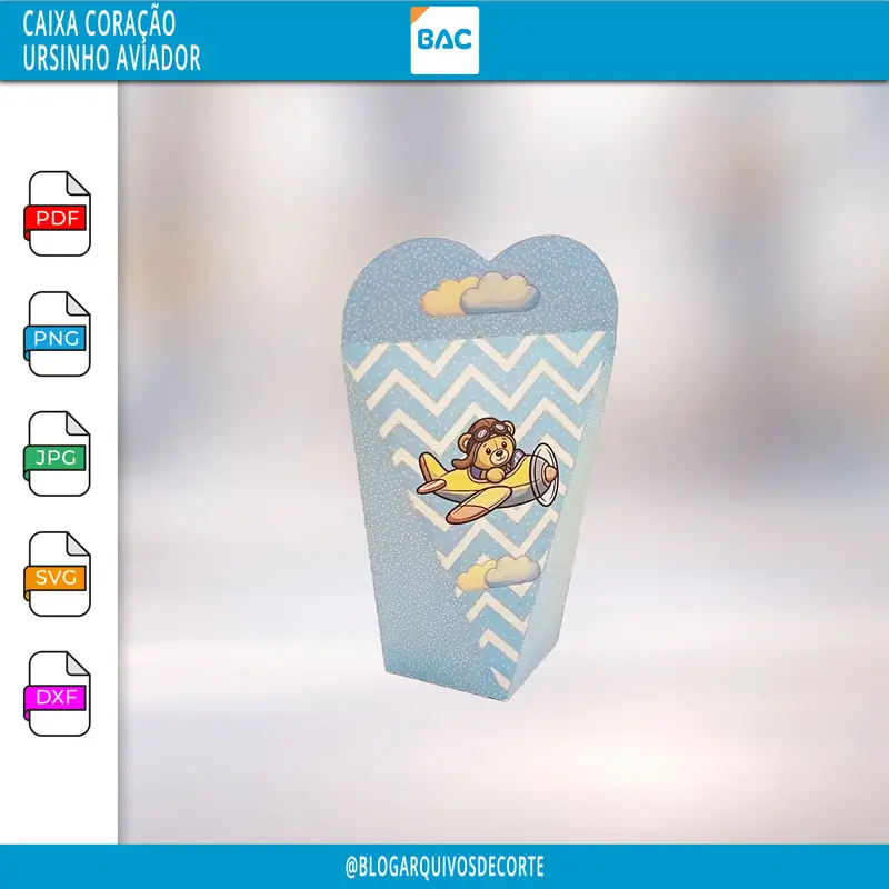 O Arquivo de Corte da Caixa Coração – Ursinho Aviador irá nos formatos jpg, png, pdf, dxf, svg e studio.