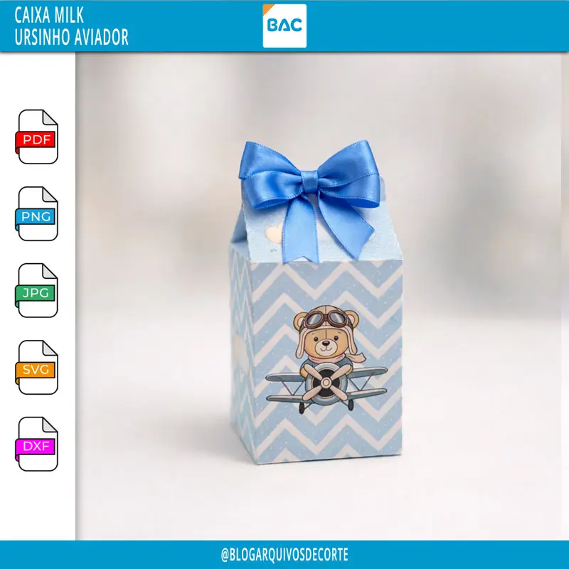 O Arquivo de Corte da Caixa Milk – Ursinho Aviador irá nos formatos jpg, png, pdf, dxf, svg e studio.