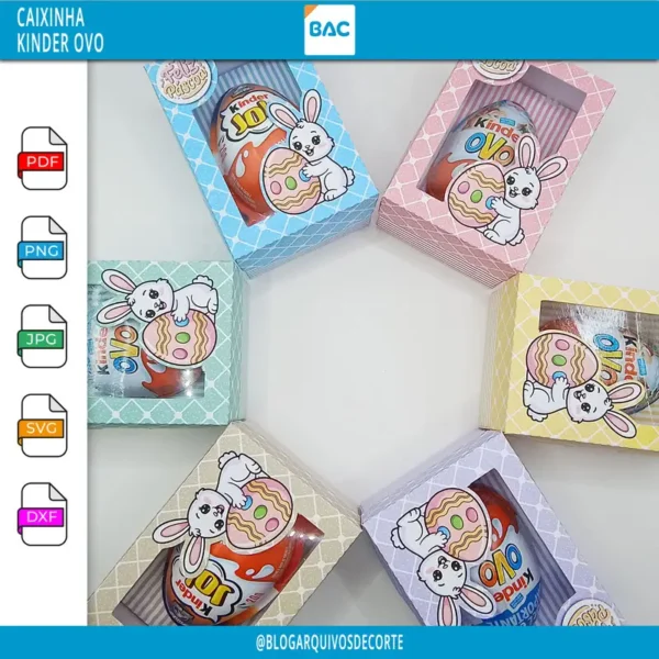 O Arquivo de Corte – Caixinha Kinder Ovo de Páscoa irá nos formatos jpg, png, pdf, dxf, svg e studio.