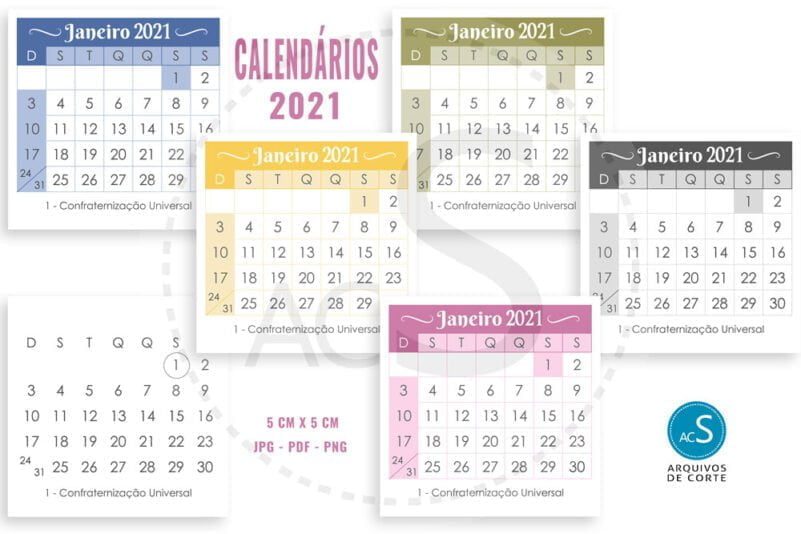 Este arquivo é composto por dois tamanhos de calendários: 5 cm x 5 cm (quadrado – proporção 1×1) e 7 cm x 5,5 cm (retangular – proporção 4×3).