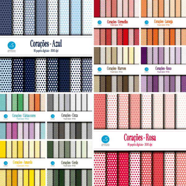 - 160 papéis digitais de corações em tons de cinza, verde, roxo, vermelho, laranja, amarelo, rosa e azul. São 16 papéis de cada tom! Além disso, esse kit também contém 16 papéis em cores variadas (Coral, Esmeralda, Fúshcia, Lilás e Tiffany).