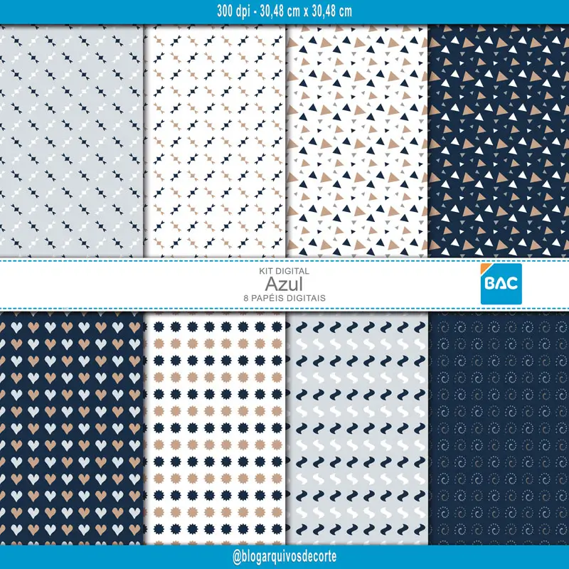 Dê elegância e leveza aos seus projetos! 8 Papéis digitais em azul com cores equilibradas e padrões delicados, perfeitos para convites, personalizados e criações que pedem um toque de calma, estilo e sofisticação.