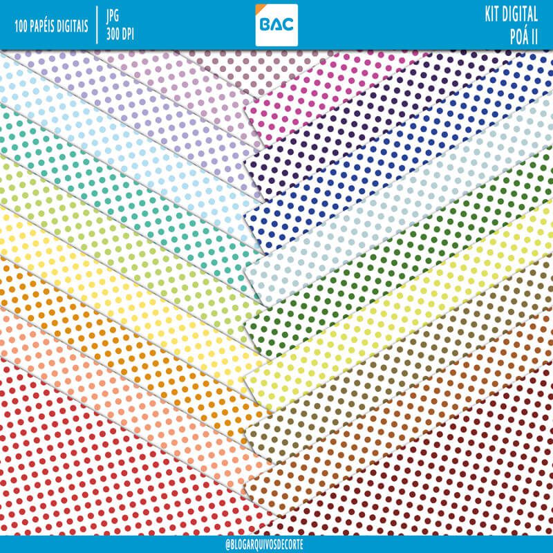 São 100 papéis digitais com estampa poá em diversas cores. Esse kit combina perfeitamente com os seguintes Kits: