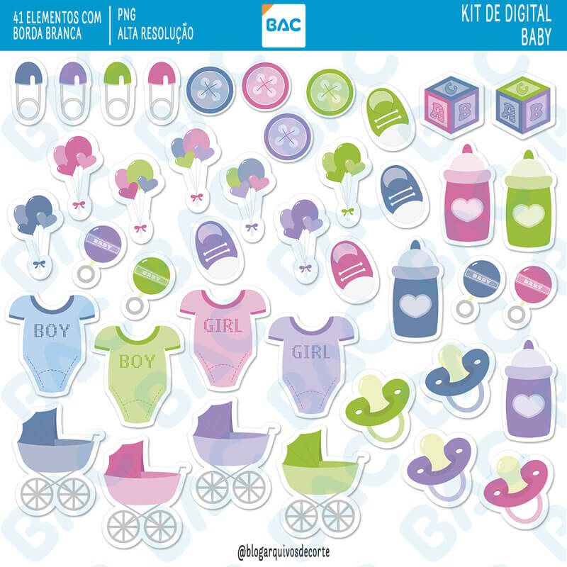 Esse Kit Digital Baby é ideal para fazer lembrancinhas de chá revelação, chá de bebê, álbuns de fotos, scrapbook, convites, foto montagem, cartões etc.