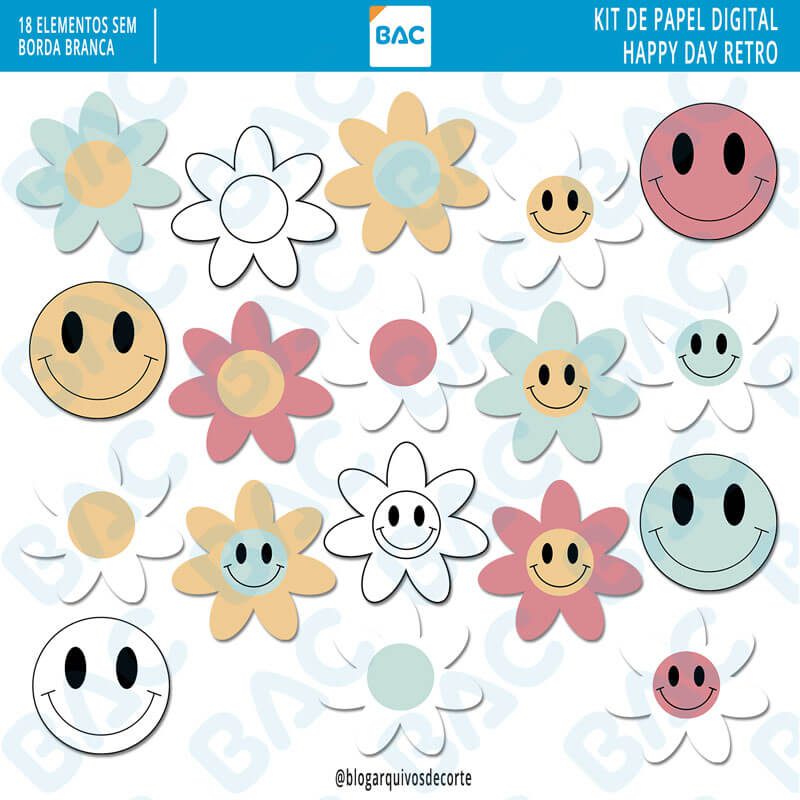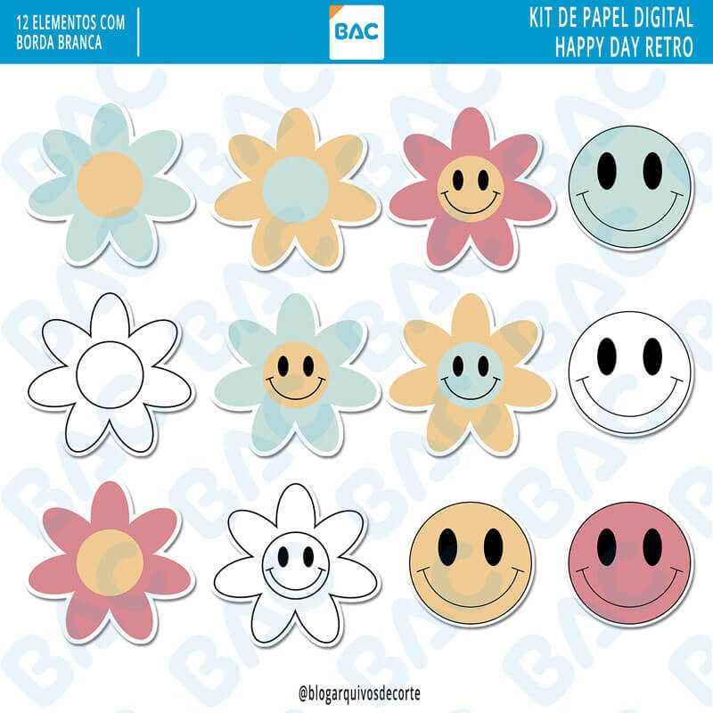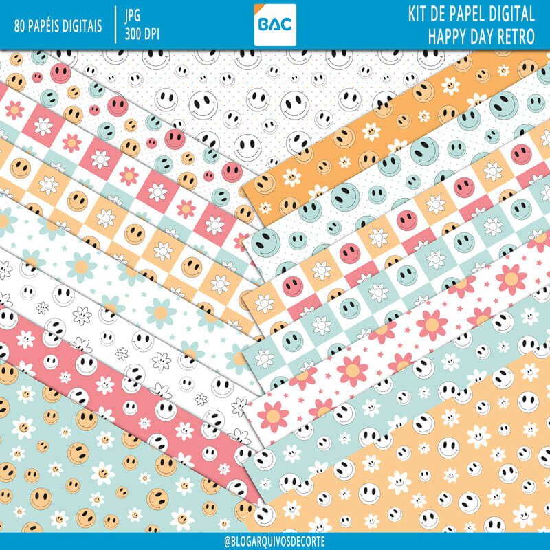 Este Kit digital Happy Day Retro pode ser usado, por exemplo, em: