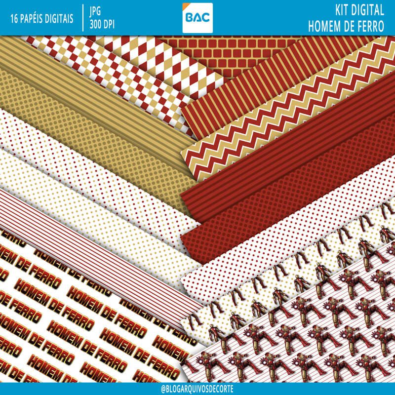 Esse Kit de Papel Digital Homem de Ferro é ideal para fazer lembrancinhas, álbuns de fotos, scrapbook, convites, foto montagem, cartões etc.