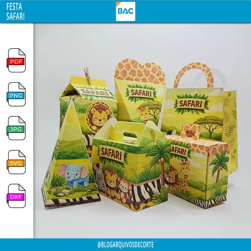 Crie uma decoração incrível com o kit festa safari para imprimir, com 6 caixinhas prontas para montar de forma rápida e prática.