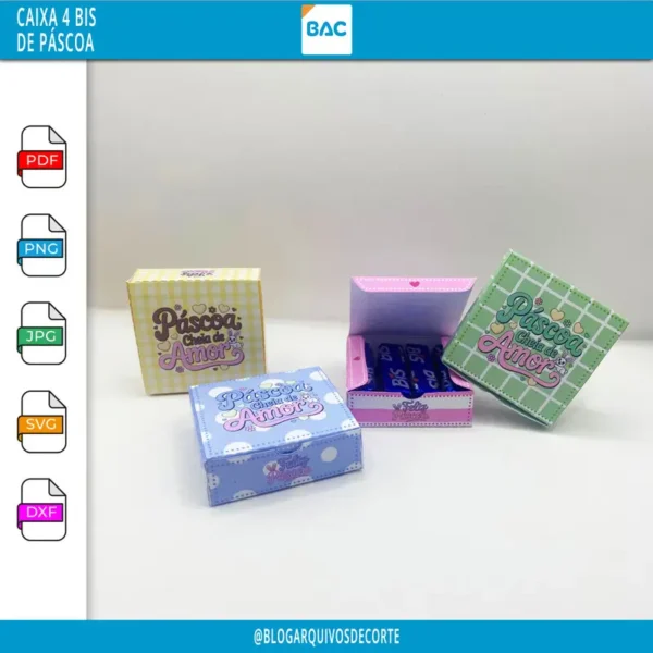 O Arquivo de Corte – Caixa 4 BIS de Páscoa irá nos formatos jpg, png, pdf, dxf, svg e studio.