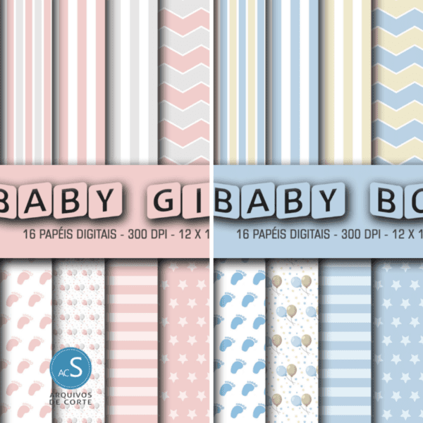 Esta oferta é composta por 2 kits de papéis digitais (Papel digital Baby Boy, Papel digital Baby Girl) da Coleção de Papel Baby. Cada kit possui 16 papéis digitais em alta resolução (300 dpi) de 12 in x 12 in. Estes kits de papéis Baby podem ser usados em: