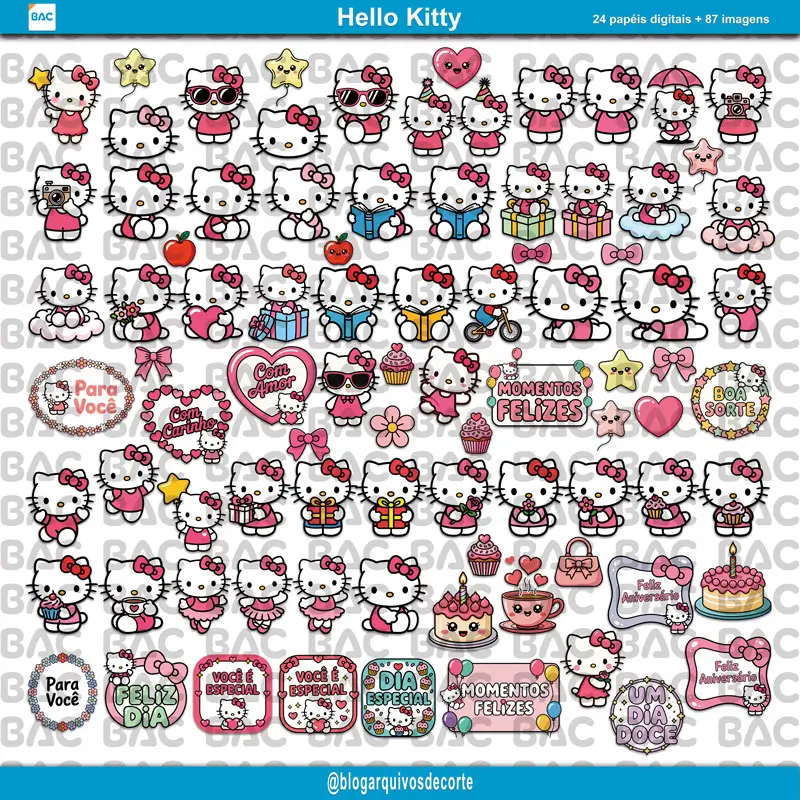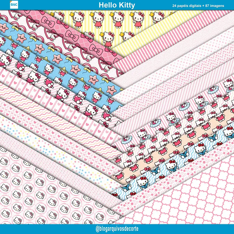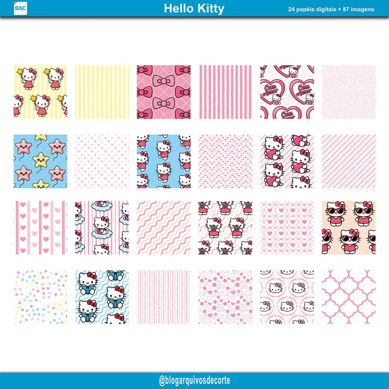 Encante-se com o Kit de Papel Digital Hello Kitty. Ele contém:
