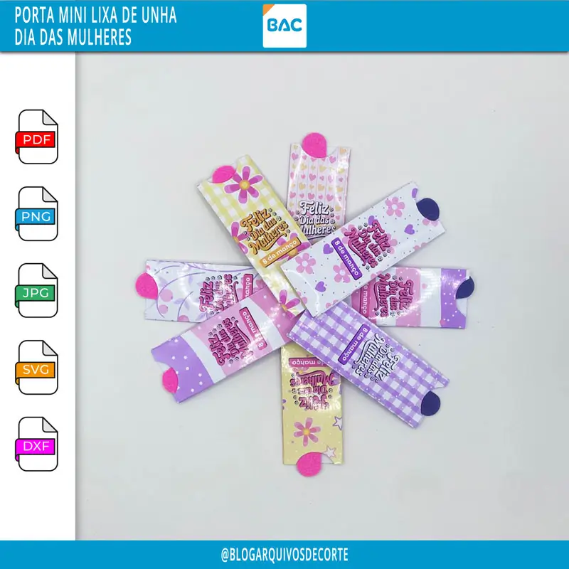 O Arquivo de Corte – Porta Lixa de Unha – Dia das Mulheres irá nos formatos jpg, png, pdf, dxf, svg e studio.
